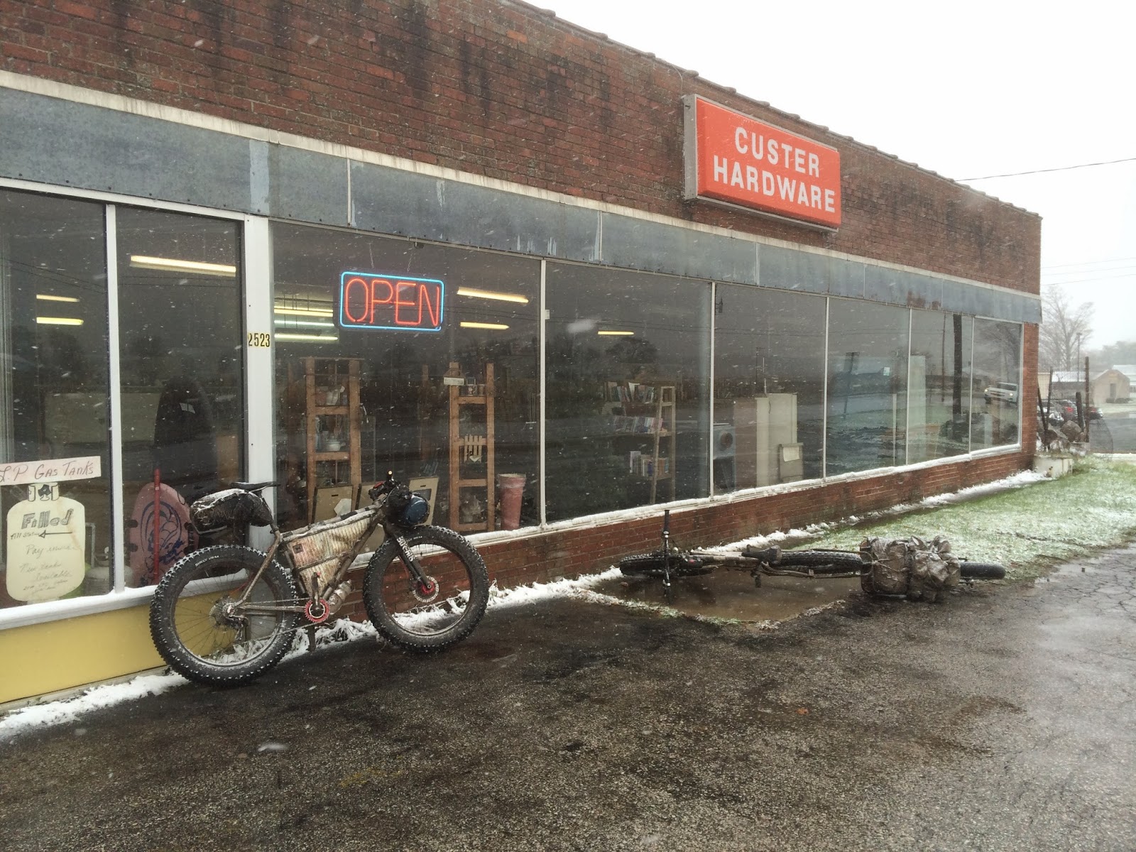 We were pretty well soaked, the cold was starting to set in and we were almost out of water because we had skipped filling up on water at the river so we could keep riding and generating heat. We had two options: 1) Keep on the planned course and head northeast on trails with no good bailout options, no shelter and no good resupply options for the next 2-3 hours of riding, or 2) take M10 back towards civilization with many options to stop at stores to warm up, dry out and snag some food/drink. It didn’t take much discussion and we hit the road towards civilization.After another hour of riding we rolled into Custer. At this point neither of us could shift because our drivetrains were frozen solid. There were not a lot of options but luckily there was an old school hardware store that we could roll into. Come to find out our brakes had frozen too!